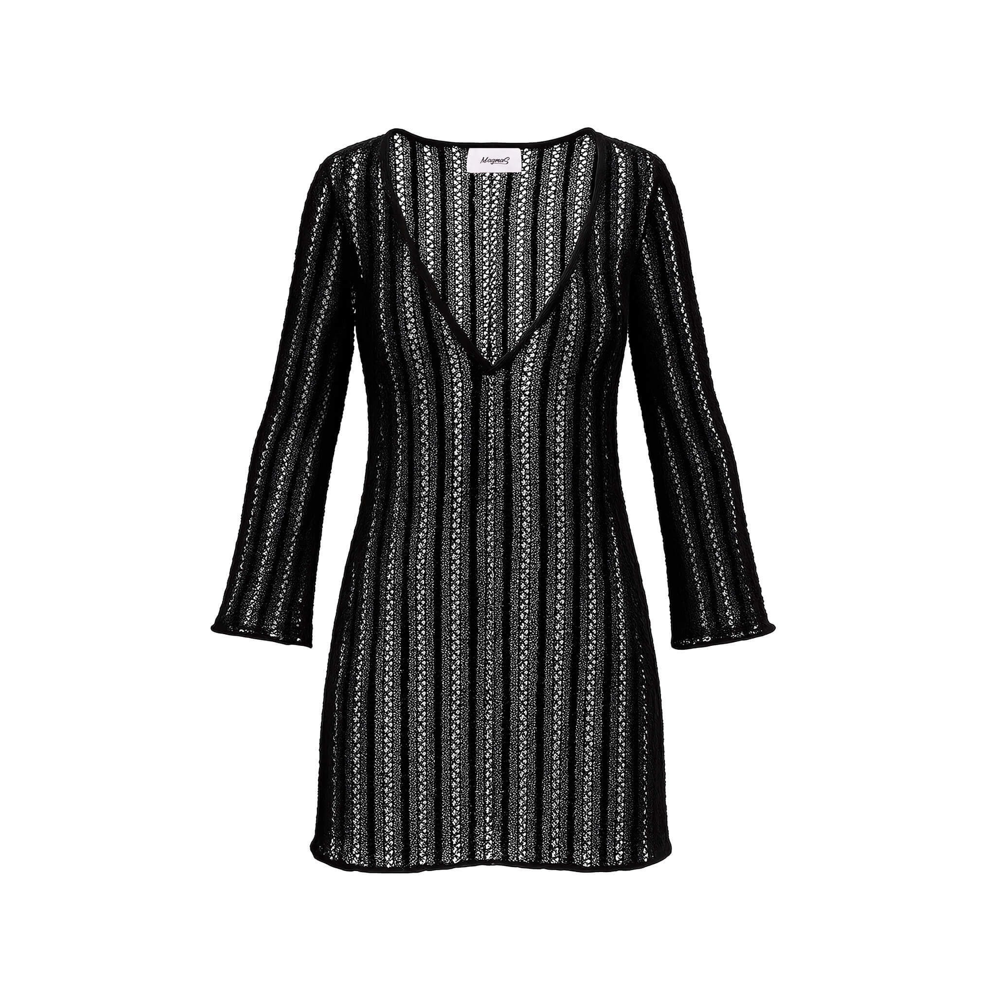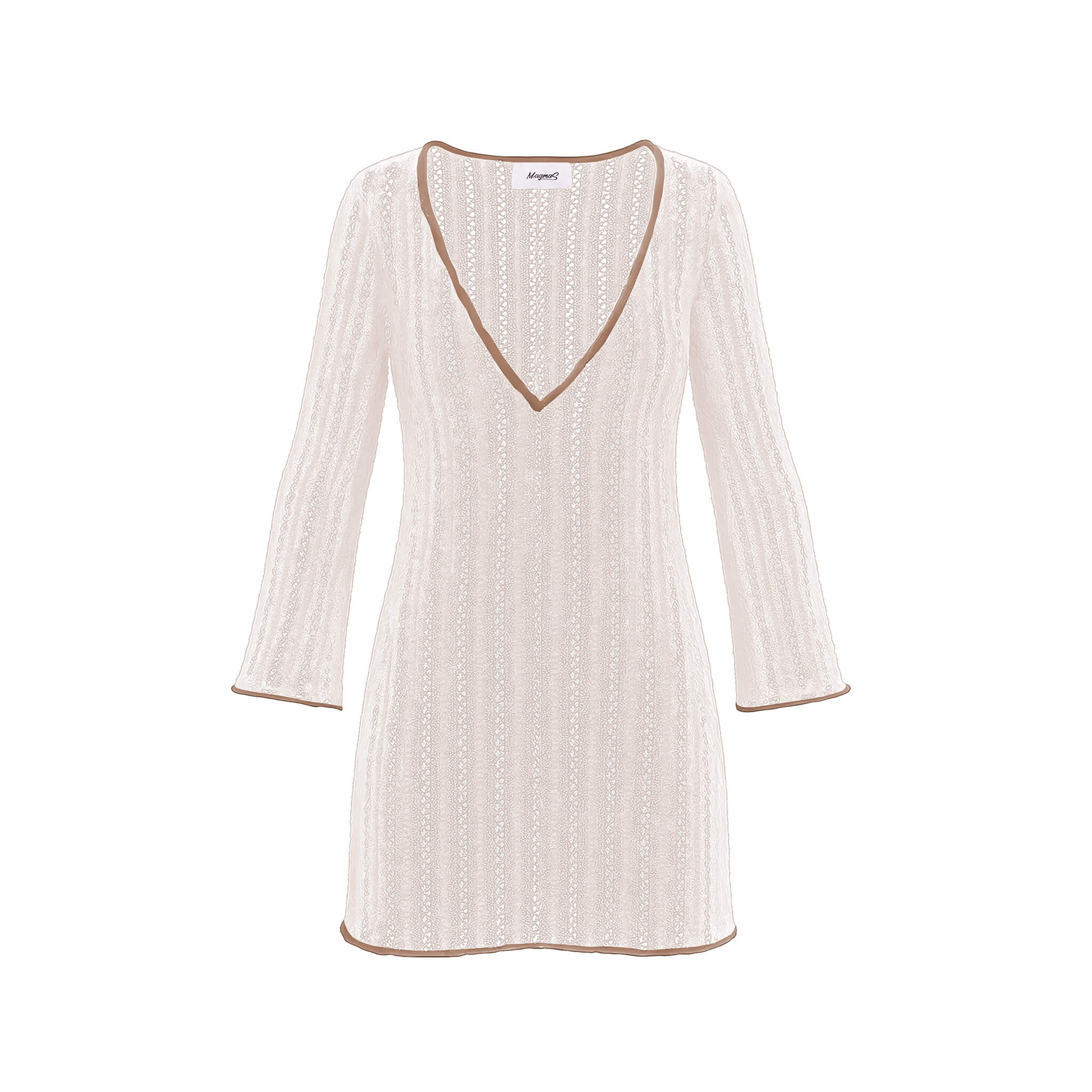 abito in tessuto traforato a manica lunga svasata sul fondo e scollo profondo sul davanti. L’abito è rifinito da un bordino impunturato su maniche, scollo e orlo.