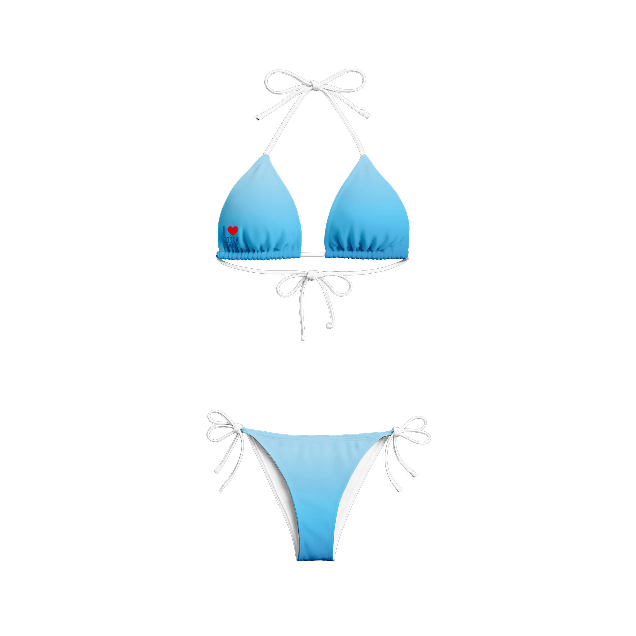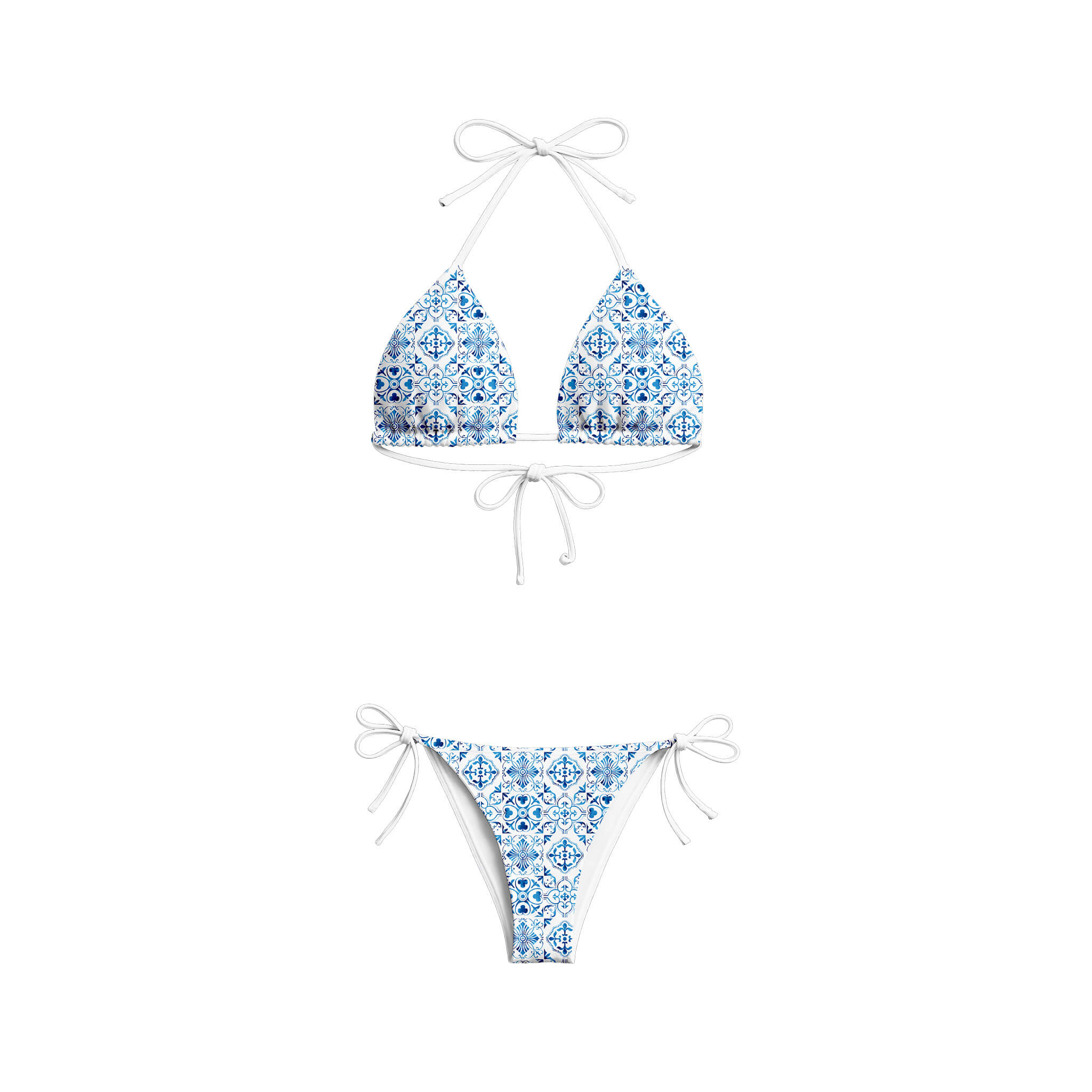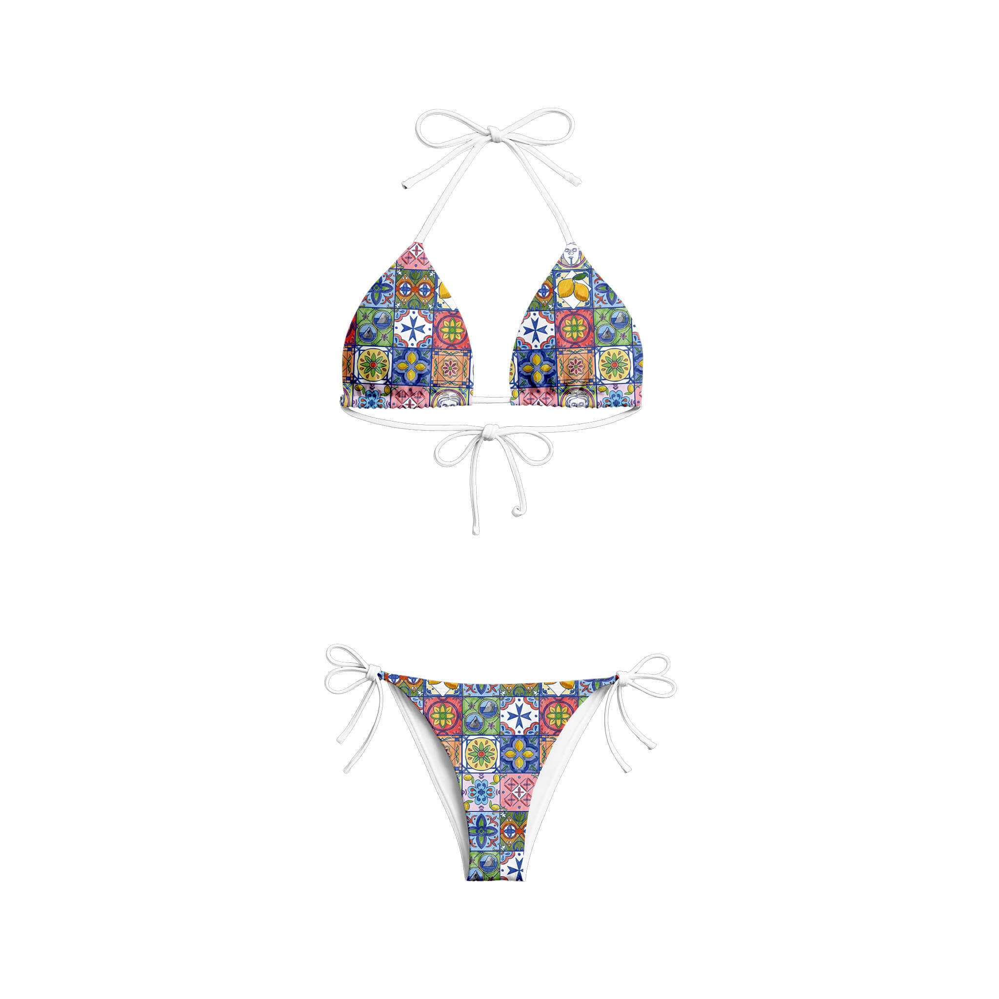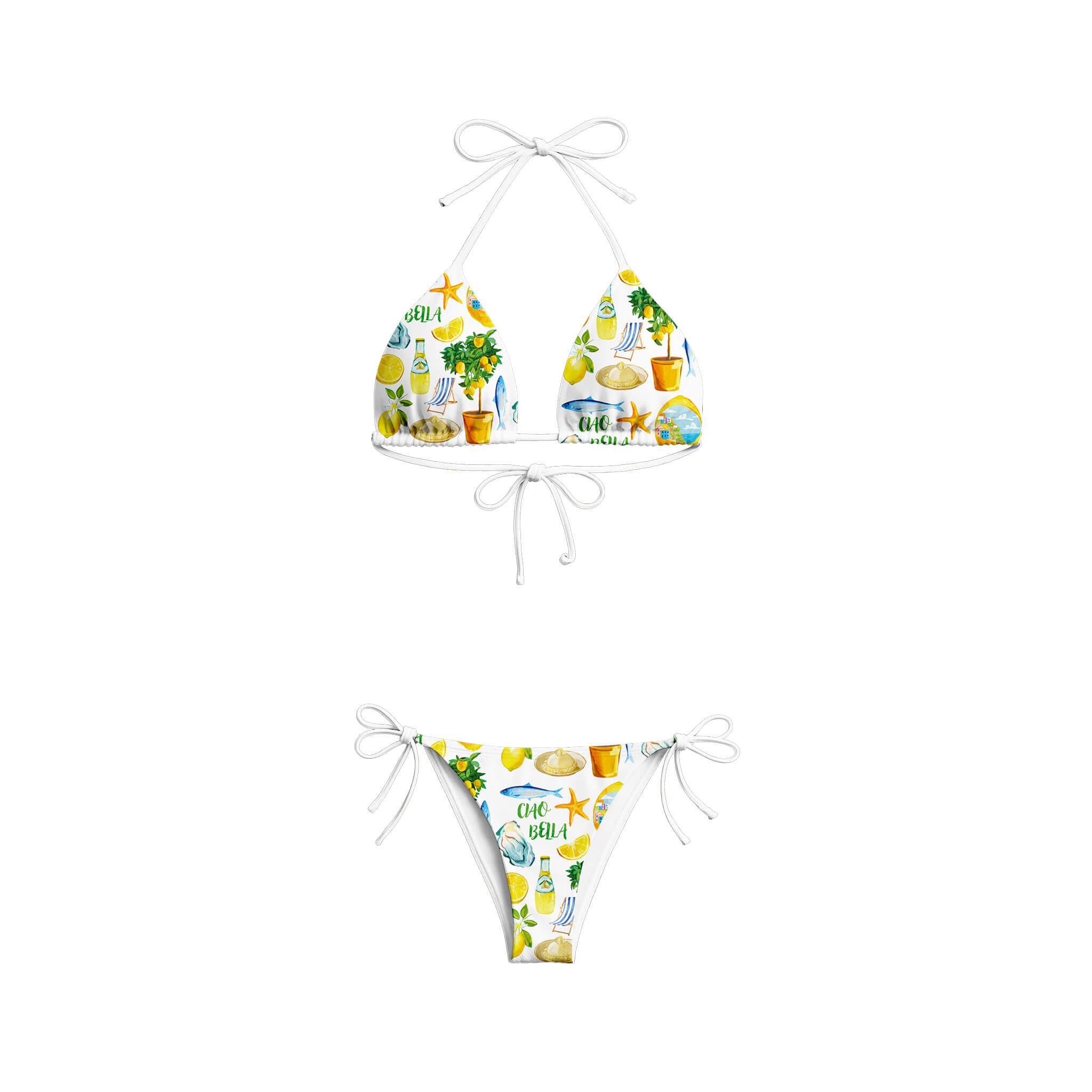 costume a due pezzi composto da: reggiseno a triangolo con ripresa e laccetti regolabili elastico in vita; slip brasiliana con laccetti regolabili. Disponibile in svariate grafiche originali, estive e dal design 100% made in Italy